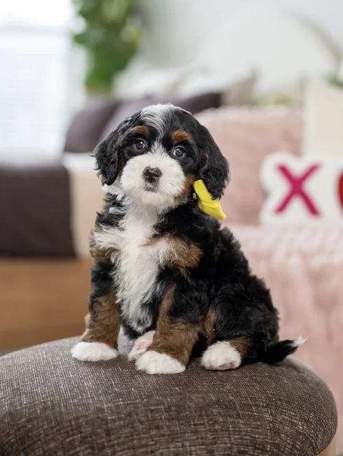 Dieser Mini Bernedoodle Welpe in klassischer Tri-Color überzeugt durch eine außergewöhnlich klare Bernese-Zeichnung und eine harmonische, kompakte Statur. Die Kombination aus typischem Berner Ausdruck und der Eleganz des Pudels macht ihn zu einem besonders gefragten Vertreter im Mini-Segment.